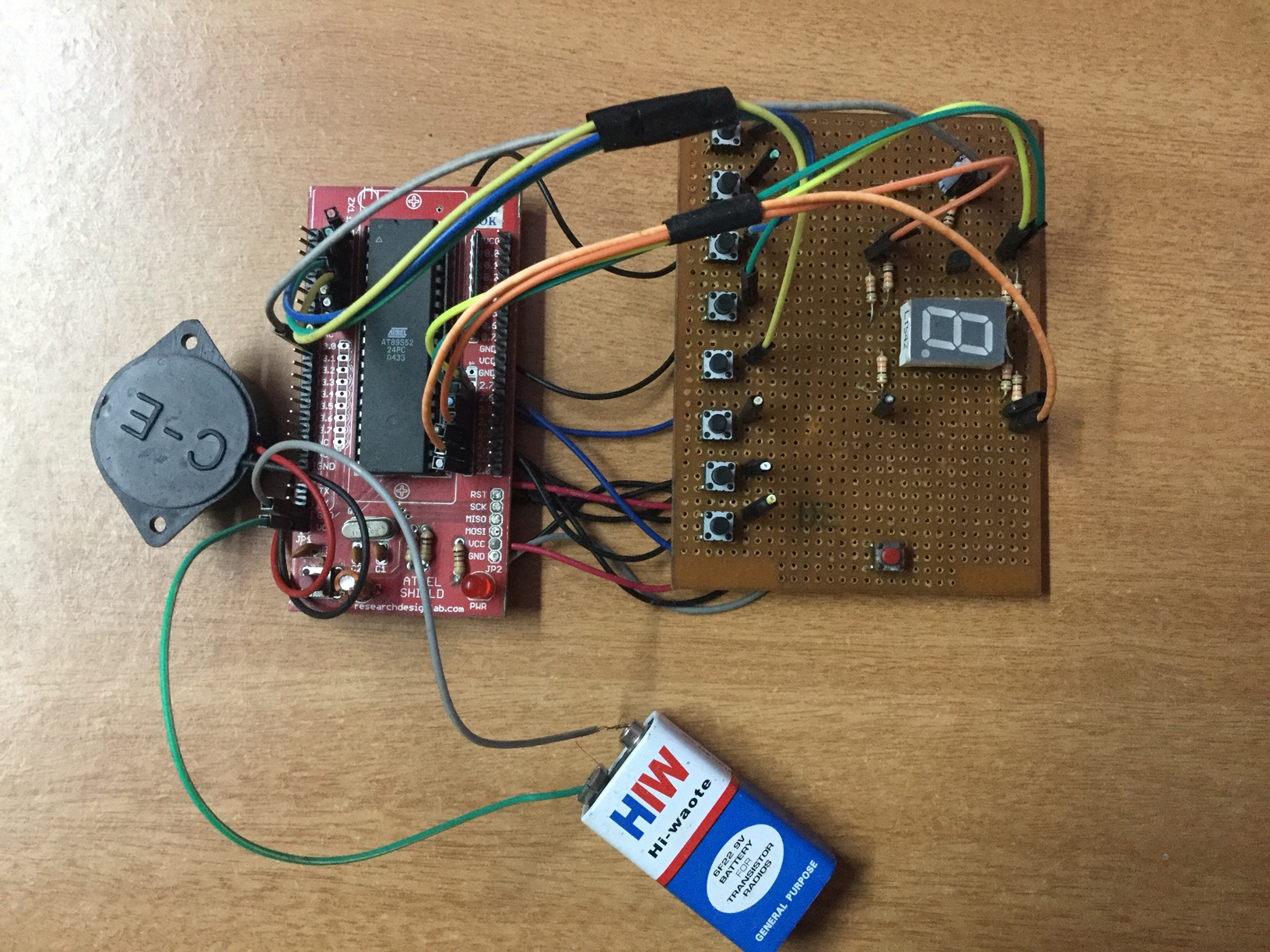 The entire operation is conducted by a microcontroller through a program written in C-language and dumped inside a microcontroller. When one of the buttons is pressed, the buzzer will start ringing and the corresponding number will be displayed on the 7-segment display.